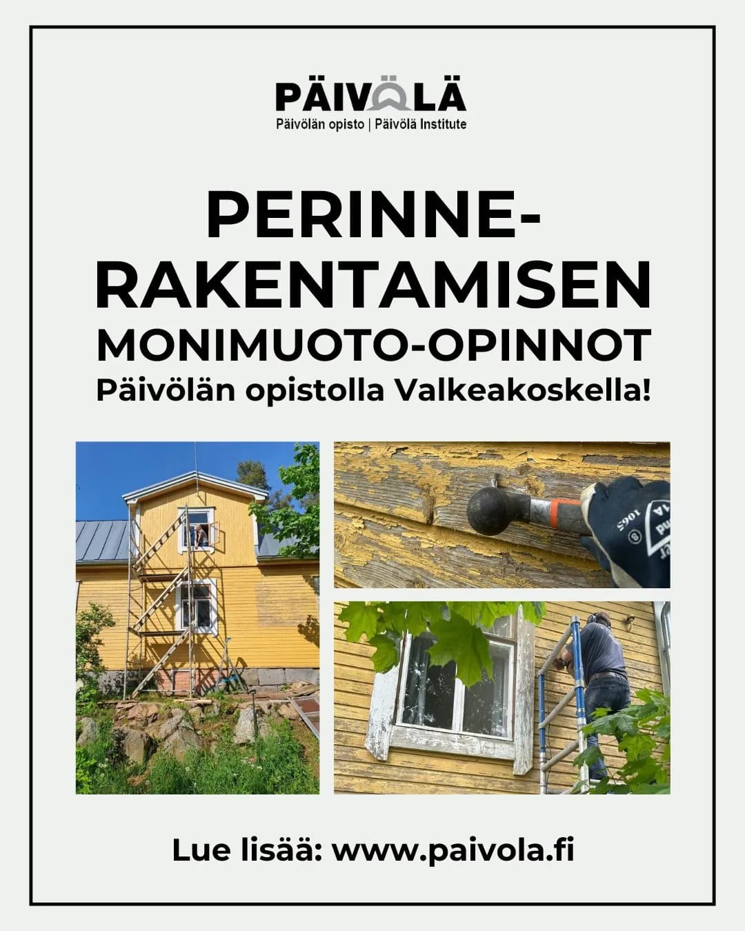 Marja Haavisto•17.12.2025 10.15 Itä-Euroopan normaaliaikaUutta Päivölässä! Perinnerakentamisen monimuoto-opinnot koostuvat yhdeksästä kevään aikana järjestettävästä viikonloppukurssista, joiden aikana tutustutaan perinnerakentamiseen sekä teoriassa että käytännössä. Jos olet haaveillut vanhan talon ostamisesta tai asut jo sellaisessa, opinnot antavat sinulle lisää tietoa ja osaamista perinnerakennusten korjaamiseen sekä rakennusten kunnon ja arvon ylläpitämiseen asumismukavuus huomioiden.