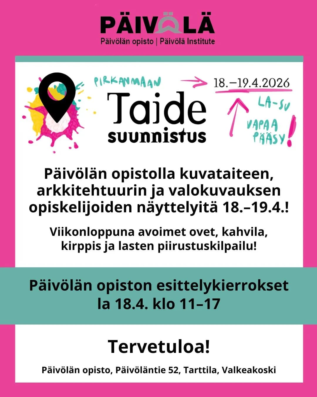 Marja Haavisto•10.3.2026 11.22 Itä-Euroopan normaaliaika•Päivitetty 8.4.2026 14.24 Itä-Euroopan kesäaikaPäivölän opiston Kuvataide- ja arkkitehtuurilinja on mukana vuosittain järjestettävässä Pirkanmaan Taidesuunnistus -tapahtumassa 18.–19.4.2026, jossa yleisöllä on mahdollisuus vierailla ateljeissa, työtiloissa, gallerioissa ja muissa näyttelypaikoissa tapaamassa tekijöitä työnsä äärellä.