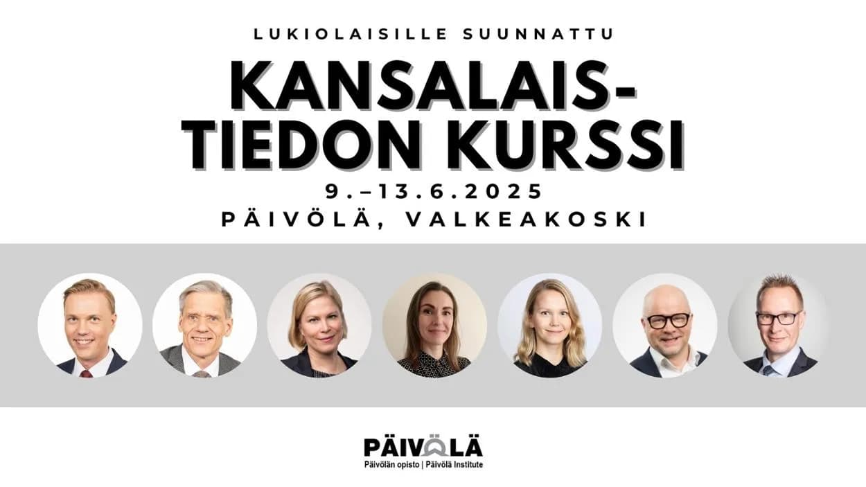 Marja Haavisto•10.4.2025 11.11 Itä-Euroopan kesäaika•Päivitetty 10.4.2025 12.27 Itä-Euroopan kesäaikaPäivölän opisto järjestää jälleen perinteisen, nuorille suunnatun kansalaistiedon kurssin 9.–13.6.2025. Pitkät perinteet omaavalle kurssille osallistuu joka vuosi yhteiskunnallisista kysymyksistä kiinnostuneita lukiolaisia ympäri Suomen. Samalla osallistujat pääsevät tutustumaan myös muihin nuoriin tulevaisuuden vaikuttajiin ja verkostoitumaan toistensa kanssa. Kurssi järjestetään yhdessä Suomalaisen Yhteiskunnan Tukisäätiön kanssa.