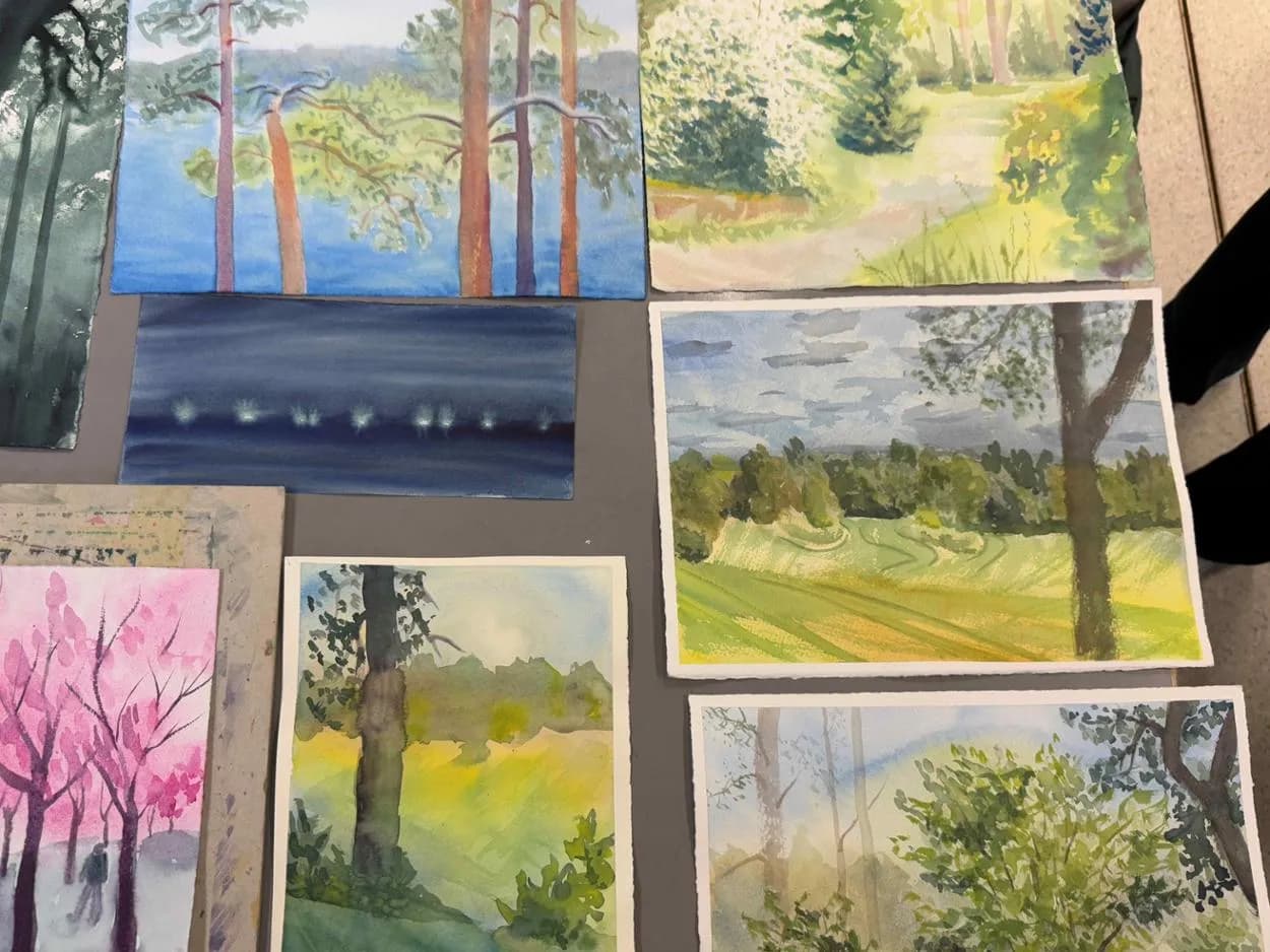 Kurssilla aiheena metsän elämää ja metsän rytmi, eri maalaustekniikat